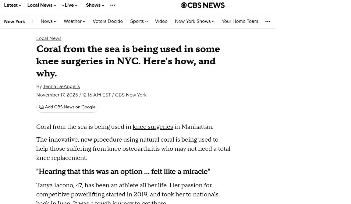 CBS featured us recently in a story about the Cartiheal coral implant for cartilage repair. This is a new treatment option for cartilage defect in the knee that I have been using for almost 3 years now in my practice. Prior to that I was an investigator in the clinical trial that resulted in the FDA approval.